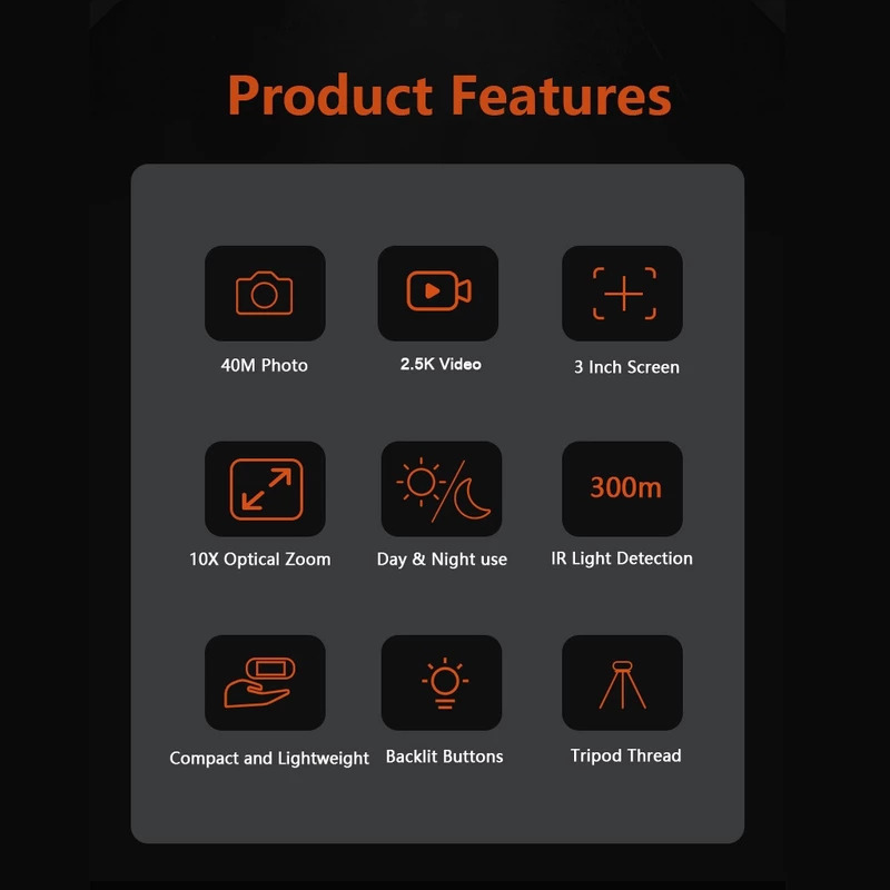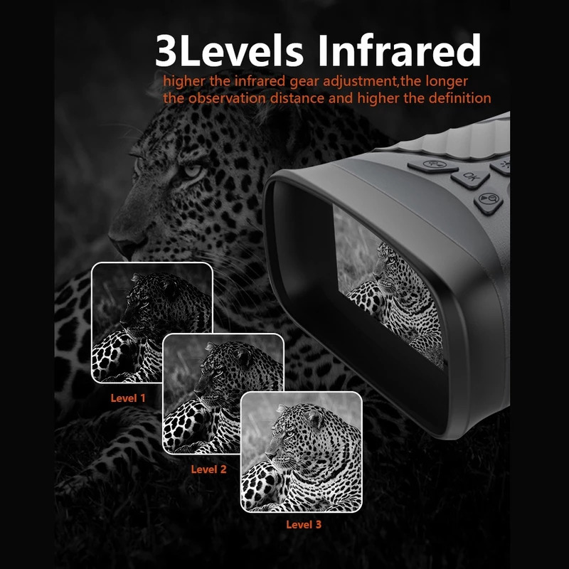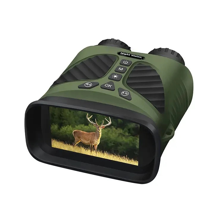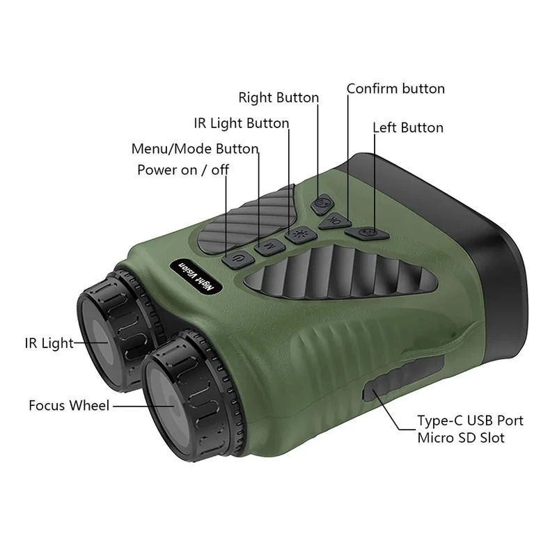 1. دوربین دوچشمی دید در شب قدرتمند با ویژگی خاص فیلمبرداری و عکس برداری، زوم اپتیکال 10 برابر، زوم دیجیتال 8 برابر 2. گرفتن تصویر یا فیلم رنگی در روز و تصویر یا فیلم سیاه/سفید در شب 3. صفحه نمایش داخلی 3.0 اینچی IPS با منوی تنظیمات به 11 زبان، آسان برای استفاده 4. مناسب برای شکار و جستجوی بازی و نظارت، تفریح در کمپینگ، ماهیگیری شبانه و قایق سواری، مشاهده حیات وحش و نجات 5. برق: 1x18650 باتری قابل شارژ 2500mah (شامل) 6. دستی و ایمن قابل نصب بر روی سه پایه 7. طراحی دکمه های نور پس زمینه سیلیکونی